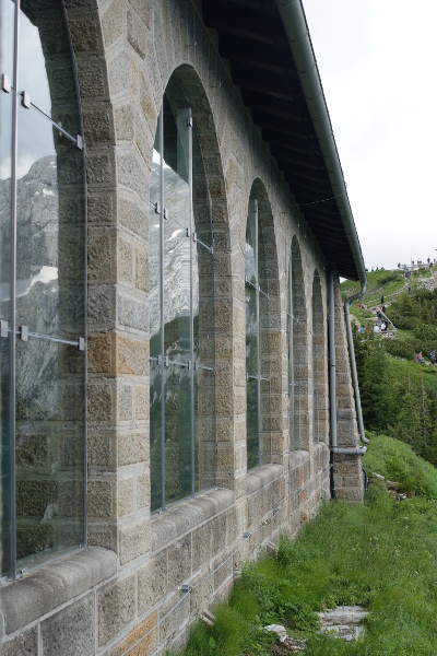 Exiting the sun terrace at the southern end takes the visitor to the new rear terrace which contains a number of outdoor tables, and from there the walk can be taken up the Mannlsteig path towards the summit, which is marked by the distinctive summit memorial cross or Gipfelkreuz, which was first erected in 1960. Probably the most famous view of the Kehlsteinhaus today is from the summit, where it can be seen sitting against the spectacular mountain-lined horizon.
